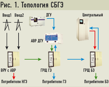 Оборудование узлов связи (серверы, телекоммуникационная инфраструктура) относится к особой группе первой категории надежности электроснабжения. Именно для этой группы необходимы системы бесперебойного гарантированного энергоснабжения (СБГЭ). Основу СБГЭ составляют специальное электрооборудование, питающие, распределительные и групповые сети. СБГЭ состоит из трех подсистем, обеспечивающих три уровня надежности электроснабжения потребителей (рис. 1).