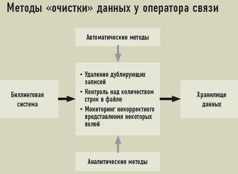 Контроль над качеством данных мобильных операторов может осуществляться по-разному. К примеру, группа компаний AT Consulting, сотрудничая с «ВымпелКомом», комбинирует автоматический и аналитический методы. Автоматический метод состоит в использовании специального программного обеспечения и детально разработанных алгоритмов загрузки данных из биллинга в хранилище. На пути из биллинговой системы в хранилище данных информация о транзакциях абонентов может подвергнуться изменениям. Такие изъяны, как дублирующие строки, заниженное число строк в файле или некорректное представление филиала, отсекаются на этапе загрузки.