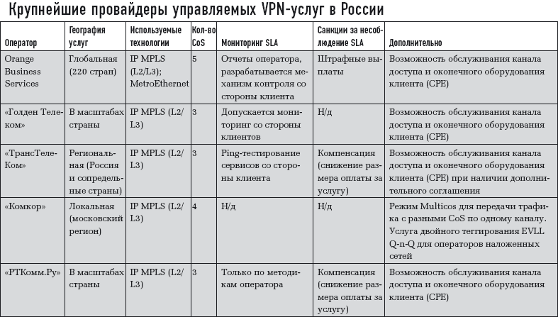 Сейчас все крупнейшие российские поставщики управляемых VPN-услуг, такие как «Эквант» (торговая марка Orange Business Services), «ТрансТелеКом», «РТКомм.Ру», «Комстар», «Комкор» и «Голден Телеком», предоставляют их на базе собственных сетей IP MPLS (L2/L3). Если идет речь об интеграции офисов клиента в масштабах города, в ход иногда идет инфраструктура операторской сети MetroEthernet. По словам заместителя генерального директора компании «Эквант» Стефана Сулье, услуги IP VPN доставляются к конечным точкам подключение не только по наземной кабельной инфраструктуре, но и по спутниковой сети Orange Business Services (технология VSAT), что гарантирует 100-процентное покрытие территории нашей страны такими сервисами.