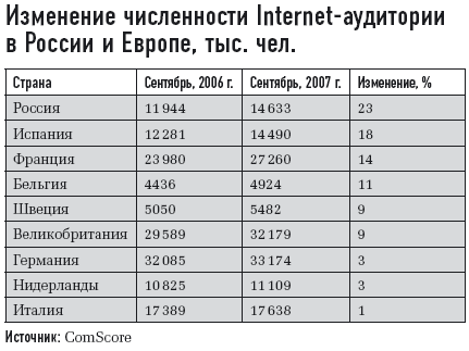 Компания ComScore обнародовала статистику изменения числа Internet-пользователей в европейских странах с сентября 2006 по сентябрь 2007 года, в соответствии с которой за этот период количество россиян, имеющих доступ во Всемирную паутину, увеличилось на 23% (до 14,6 млн). По динамике развития рынка наша страна оставила далеко позади занявшую второе место Испанию, где Internet-аудитория растет примерно на 18% в год. Фонд «Общественное мнение» (ФОМ) подсчитал, что годовой прирост числа отечественных пользователей с весны 2006 составил 20,39%.