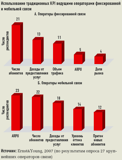 Как свидетельствует исследование аналитической отчетности 27 крупнейших операторов разных стран, включая AT&T, British Telecom, France Telecom, Deutsche Telekom, China Mobile, Sprint-Nextel, SK Telecom, Verizon и Vodafone, операторы фиксированной и мобильной связи присваивают разный вес одним и тем же показателям (см. рисунок). После обновления портфеля услуг и бизнес-моделей информативность таких показателей снижается. Однако, отмечают аналитики Ernst&Young, нынешние метрики требуют не замены, а большей детализации, причем поначалу разной у разных операторов. Авторы исследования подчеркивают: когда некий «идеальный» набор KPI, полностью устраивающий инвесторов, будет внедрен хотя бы одним крупным оператором, он сразу же станет стандартом де-факто.