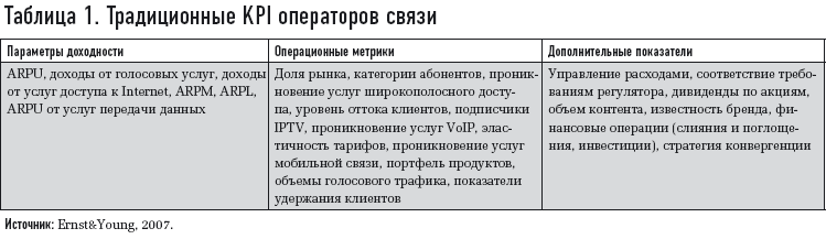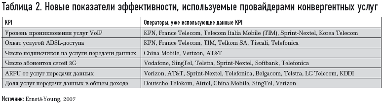 Общий вектор предполагаемых изменений состоит в смещении акцента с уровня доходов и использования имеющейся инфраструктуры к размерам прибыли и востребованности сервисов. А детализация KPI означает, например, что вместо определения общих значений ARPU или процента оттока клиентов оператор начнет рассчитывать среднемесячные доходы с абонента, обеспечиваемые разными пакетами услуг. Кроме того, он будет сопоставлять интенсивность оттока в группах подписчиков, которым были предложены разные наборы сервисов. Ernst&Young отмечает, что крупные операторы уже переходят на новые KPI (табл. 2), учитывающие специфику их деятельности, и в ближайшие годы эта тенденция будет набирать силу.