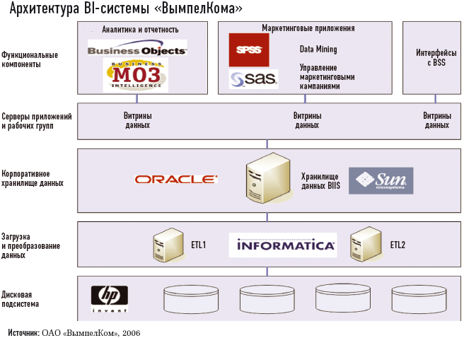 Основным источником данных стало имевшееся в компании хранилище данных. Как сообщил Сергей Федечкин, заместитель директора по архитектуре систем управленческой информации и отчетности «ВымпелКома», в конце 2006 года объем хранилища превысил 70 Тбайт, а общее число таблиц БД перевалило за 500. При этом для каждого абонента было создано 450 KPI, и ежедневно в хранилище загружалось около 150 Гбайт новых сведений. Помимо решения SPSS в проекте использованы ETL-инструментарий фирмы Informatica, средства OLAP и генерации отчетов от Business Objects, СУБД компании Oracle, программы управления маркетинговыми кампаниями производства SAS.
