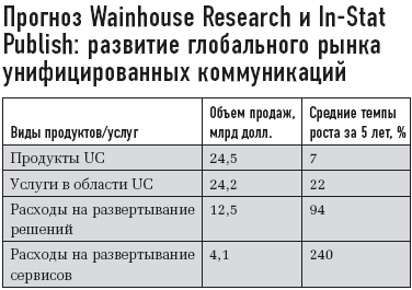 По прогнозам аналитических компаний Wainhouse Research и In-Stat Publish (совместный отчет Unified Communications Products and Services Forecast), к 2012 году мировой объем рынка системных продуктов для унифицированных коммуникаций (IP-УАТС, серверы ВКС, унифицированной почты и т.п.) вырастет до 24,5 млрд долл. Усредненные темпы роста данного сегмента в течение пяти ближайших лет составят 7% в год. Еще более активно (на 22% ежегодно) будет прирастать рынок сервисных компонентов в области унифицированных коммуникаций (услуг IP Centrex, хостинга телефонных систем и пр.). Ожидается, что объем данного сектора увеличится к 2012 году до 24,2 млрд долл.