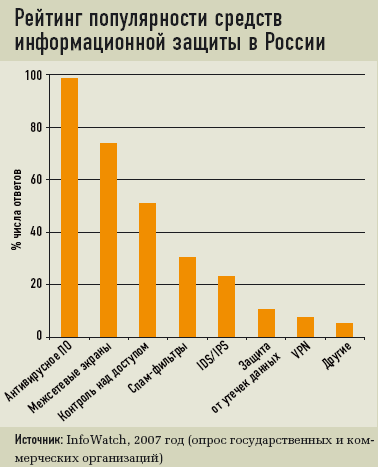 Среди наиболее распространенных средств ИБ в 2006 году по-прежнему лидировали антивирусы (98,6%). Кроме того, в рейтинг популярности российских пользователей попали программы защиты от спама (30,5%), системы обнаружения и предотвращения вторжений (23%) и системы предотвращения информационных утечек (10,5%), к которым специалисты частично относят и средства контентной фильтрации. Всего за один год процент использования средств защиты от утечек увеличился более чем в пять раз. Однако и сейчас этот уровень остается низким по сравнению с угрозой, которую представляют собой инсайдеры.