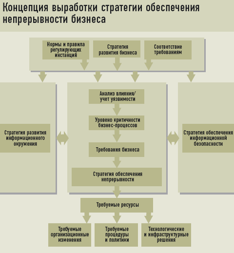 Ее неотъемлемая часть — внедрение процесса обеспечения непрерывности бизнеса на общекорпоративном уровне с привлечением максимального количества структурных подразделений. В свою очередь, процесс обеспечения непрерывности должен соотноситься со стратегией развития ИТ и стратегией обеспечения информационной безопасности. Только на стыке трех указанных стратегий можно формировать четкие корпоративные требования к ИТ-ресурсам (производительности, отказоустойчивости, непрерывности и масштабируемости) и к поддерживающей их инфраструктуре.