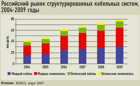 Традиционные локальные сети предприятий все еще остаются крупнейшими потребителями СКС (на этот сегмент рынка, согласно FTM, приходятся 64,4% глобальных продаж), а в сектор ЦОДов поставляются 12,1% решений и продуктов СКС. В дата-центрах, где востребованы медные и волоконно-оптические кабельные системы, ежегодные темы роста потребления СКС в течение пяти лет составят примерно 26,8% (это в 1,7 раза больше темпов роста всего рынка). К 2011 году доля поставляемых СКС для ЦОДов увеличится почти до 31% и достигнет 2,2 млрд долл.
