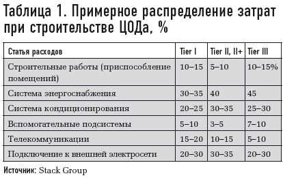 Примерное распределение затрат по основным статьям расходов, основанное на практике Stack Group, приведено в табл. 1. Как уже отмечалось, расчетное количество электрической мощности, отнесенное к 1 кв. м полезной площади, может серьезно скорректировать базовые пропорции. Данные этой таблицы хорошо коррелируют с показателями, определенными The Uptime Institute. В одном из его документов говорится: «Анализ структуры расходов на строительство дата-центра показывает, что на электромеханические (инженерные) системы приходится 70% или более себестоимости всего строительства — в зависимости от плотности размещения оборудования и функциональных возможностей».