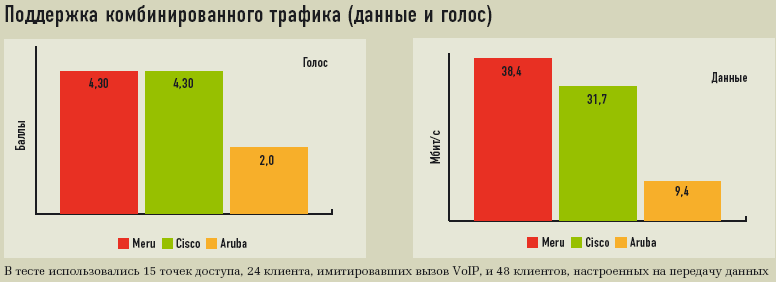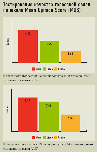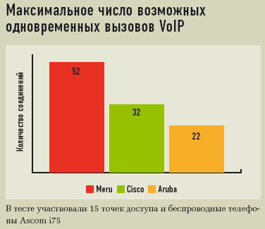 Архитектура Meru обеспечила и лучшую поддержку голосовых приложений. Она смогла обрабатывать больше одновременных телефонных вызовов (Novarum при тестировании не выявила верхнего предела). Когда в сети установили 10 точек доступа Cisco, WLAN поддерживала примерно 24 вызова VoIP. А когда число одновременных вызовов увеличивалось до 48, сеть Cisco оказалась неспособной поддерживать нужное качество передачи голоса. В тестах с Wi-Fi-телефонами инфраструктура Cisco показала верхний порог производительности 26–28 одновременных вызовов.