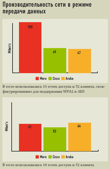 При тестировании оборудования Meru в офисе установили пять точек доступа, и все они работали на одном канале. Потом были добавлены еще два набора по пять точек доступа — каждый с отличным от другого каналом на 2,4 ГГц. Все точки были включены на максимальную мощность. Meru обеспечила 100 Мбит/с пропускной способности системы, что в два раза больше показателей Cisco и Aruba. Интересно, что суммарная пропускная способность оборудования Meru упала до 60 Мбит/с, когда число точек доступа уменьшили до 10.