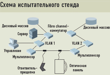 В Центре компетенций компании «Открытые технологии» был собран стенд для исследования возможной уязвимости ВОЛС, представляющий собой модель распределенного центра обработки данных. Оптическая магистраль имитировалась кросс-панелью с петлей из разделанного многожильного оптического кабеля для внешней проводки. В качестве перехватчика использовалось пассивное устройство типа «ответвитель-прищепка» FOD 5503. Такое устройство создает микроизгиб в волокне и ответвляет сигнал, который может быть получен через имеющийся патч-корд. В процессе тестирования удалось перехватить сигнал, передаваемый в одном направлении.