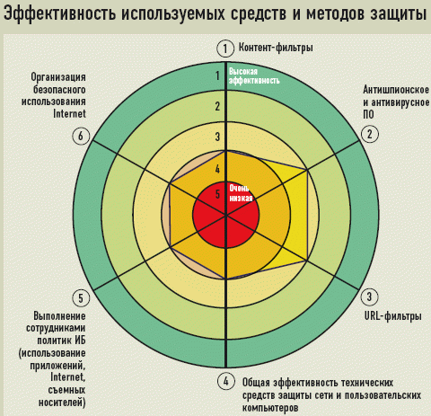 Как видно из рисунка, эффективность использования всех средств защитного арсенала предприятий далека от совершенства. Объясняется это не только и не столько их функциональными недостатками, сколько ошибками в конфигурировании отдельных продуктов и организации взаимодействия отдельных систем между собой. Нельзя забывать и о том, что пользователи могут отключать или обходить некоторые механизмы защиты.