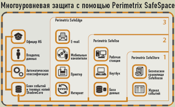 Комплексность платформы означает вертикально-интегрированный подход к ее внедрению в корпоративную информационную среду. На верхний (надлежащий) уровень выводятся функции анализа бизнес-логики приложений, контроля над безопасностью бизнес-процессов и проактивного управления инцидентами (то есть реагирования не на сами инциденты, а на возможности их возникновения). На нижнем уровне интеграционная платформа стыкуется с прикладными системами корпоративного управления (ERP, CRM, SCM ит.д.), генерирующими конфиденциальный контент. Поскольку объектами защиты Perimetrix являются вовсе не ИТ-приложения или какие-то сетевые узлы, а сами данные, то ни унаследованные средства ИБ, ни характер работы приложений не влияет на эффективность работы SafeSpace.