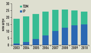 Оценки Canalys базируются не на объеме продаж, а на количестве инсталлируемых абонентских линий. В сентябре 2004 года эта аналитическое агентство сделало такой прогноз: в регионе EMEA число продаваемых IP-портов резко возрастет с 2,4 млн штук в 2004 году до 15,2 млн в 2010-ом. Доля IP-систем в общем объеме продаж составит 63%, а доля TDM-платформ — лишь 37%.