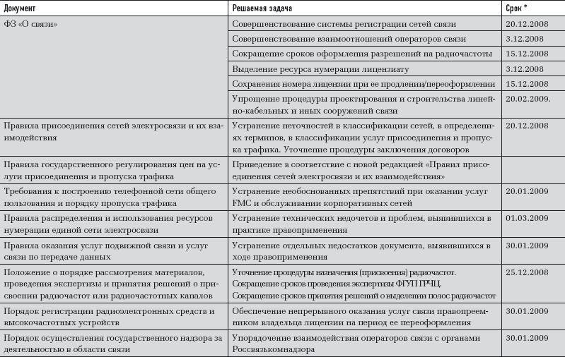План работы утвержден 2 декабря заместителем министра Наумом Мардером, который курирует вопросы развития связной отрасли. В списке фигурируют 14 отраслевых документов, которые должны подвергнуться редактированию и коррекции. В частности, под прицел новой команды законотворцев попали: