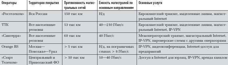 Одними из основных особенностей рынка магистральных сетей в последние годы стали увеличение числа поставщиков услуг, фрагментация этого рынка по видам деятельности и географическому признаку. К двум известным национальным владельцам магистральных ВОЛС прибавились компании, работающие на региональном и межрегиональном уровнях и постепенно расширяющие ареалы присутствия вслед за экспансией бизнеса их клиентов. К ним можно отнести Orange Business Services, «Голден Телеком» (ныне работает под брэндом «Билайн»), «Комстар-ОТС» и «Старт Телеком». А «Синтерра», которая располагает DWDM-сетью общей протяженностью порядка 68 тыс. км с узлами подключения в 170 населенных пунктах РФ, фактически превратилась в третьего игрока общефедерального масштаба, альтернативного «Ростелекому» и ТТК.