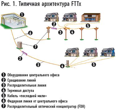 Специфика комбинированного подхода в полной мере нашла отражение в аббревиатурах FTT (рис. 1), обозначающих семейство архитектур, в которых оптоволокно частично или полностью заменяет кабельную проводку на «последней миле». В случае FTTc (Fiber to the Curb) волоконно-оптическая линия связи простирается до терминирующего узла, вынесенного за границы здания, где находится оборудование конечных пользователей. Подключение абонентов осуществляется по коаксиальному кабелю или витой паре.