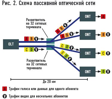 Пассивная оптическая сеть (PON), рис. 2, реализует топологию «точка — много точек», позволяя по одному оптоволокну предоставлять услуги доступа 32 пользователям, а в отдельных случаях — даже 128. Вместо дорогостоящего активного оборудования в PON используются пассивные разделители, ответвители и аттенюаторы. Совокупность этих устройств вместе с оптоволоконными линиями именуется «оптической распределительной сетью» (ODN). Оборудование, установленное на операторском конце соединения называется «терминальным устройством оптической линии» (OLT), а на пользовательском конце — «терминальным устройством оптической сети» (ONT).