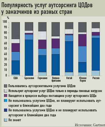 Самостоятельную проблему представляет собой менталитет заказчика, его неготовность передать часть функций, от которых напрямую зависит компания, в чужие руки. Особенности российского бизнеса (прежде всего, невысокий уровень прозрачности и общий дефицит доверия) еще больше усугубляют ситуацию: к услугам аутсорсинга в области ЦОДов отечественные заказчики прибегают довольно редко, поэтому по объему данного сегмента ИТ-рынка Россия пока заметно отстает от развитых стран.