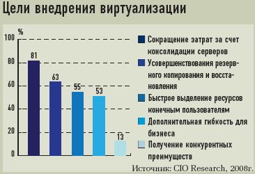 Виртуализированных систем любых типов, по оценкам Intel, уже в прошлом году насчитывалось в мире около до 23 млн. Аналитики Penn, Schoen & Berland Associates утверждают, что к 2010 году в мире будет виртуализировано лишь 25% ИТ-инфраструктуры ИТ. Не в последнюю очередь так произойдет потому, что только 30% заказчиков расценивают виртуализацию как важный инструмент повышения эффективности бизнеса.