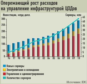 Однако главный путь к успеху виртуализационных проектов находится в области управления. Недаром аналитики Gartner предупреждают, что внедрение систем виртуализации без развитых средств управления сопряжено с большими рисками для бизнеса, чем недооценка рассматриваемой технологии. Проведенный IDC анализ динамики затрат организаций на приобретение серверов, системы электропитания и охлаждения и управление серверным парком с 1996 года по наши дни свидетельствует, что расходы на управление с начала текущего десятилетия превышают другие статьи расходов вместе взятые, причем со временем разрыв только увеличивается. Это обусловлено продолжающимся нарастанием сложности ИТ-инфраструктуры, а рост числа виртуальных машин лишь усугубляет ситуацию. Именно по данной причине в последние пару лет прогресс в области виртуализации ЦОДов аналитики напрямую связывают с автоматизацией административных процедур, которая обеспечит динамическое распределение ресурсов в соответствии с нагрузкой и управление на основе правил. Таким способом можно организовать точный контроль над взаимодействием серверов, систем хранения, сетевого оборудования, ПО и приложений конечных пользователей, обеспечить сквозное отслеживание и автоматизацию операций, реализующих ИТ-сервисы и процессы управления ими.