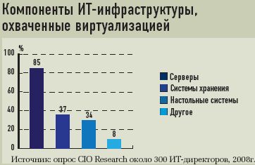 Принято считать, что виртуализация является лучшим способом преодоления неконтролируемого разрастания ИТ-инфраструктуры и сдерживания роста эксплуатационных затрат. В пользу этой точки зрения свидетельствуют следующие оценки. Виртуализация и консолидация серверного парка позволяют на 30—50% сократить затраты на закупку оборудования, на 70—80% снизить эксплуатационные расходы. Во многих случаях благодаря виртуализации на 20—40% удается сократить площади, занимаемые серверами и системами хранения. Если говорить только о крупных системах хранения, то, согласно оценкам компании ESG, их виртуализация сокращает расходы на оборудование почти на 24%, на программное обеспечение — более чем на 16%, на администрирование — приблизительно на 20%. Коэффициент использования систем хранения возрастает с 20% примерно до 70%.