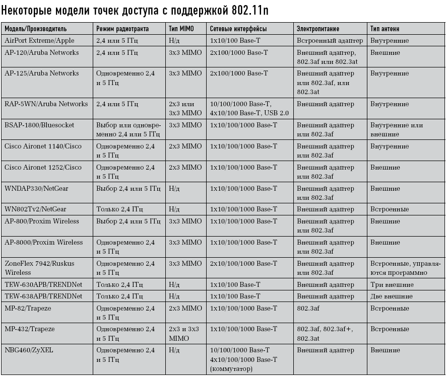 Компания NetGear разработала целое семейство точек доступа нового стандарта. В их числе — точка доступа WNDAP330, работающая на частоте 5 ГГц для предотвращения помех от сетевых устройств 802.11b/g и поддерживающая переключение в диапазон 2,4 ГГц для обратной совместимости с этими стандартами. Используется электропитание поверх Ethernet (технология 802.3af). Точка доступа WNAP210 предназначена только для работы в диапазоне 2,4 ГГц. По заверению производителя, она поддерживает одновременную работу до 30 пользователей. WN802Tv2, также ориентированная на диапазон 2,4 ГГц, обеспечивает режим WDS для расширения покрытия сети и назначение приоритетов по видам трафика. Наконец, WN802T расширяет домашнюю сеть или сеть небольшого офиса за счет поддержки максимальной скорости передачи до 300 Мбит/c и подключения по Gigabit Ethernet к магистральной сети.