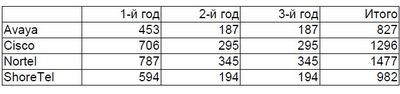 Затем специалисты Nemertes оценили среднюю совокупную стоимость владения решениями VoIP в течение первых трех лет эксплуатации. Типичные затраты заказчиков, включающие в себя только капиталовложения и текущие расходы на оплату труда персонала, обслуживающего оборудование VoIP, составили для решений Avaya – 827 долл., ShoreTel – 982 долл., Cisco — 1296 долл., Nortel — 1477 долл. в пересчете на терминал.