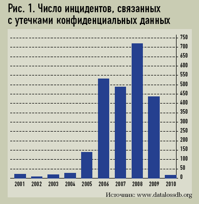 Изменяющееся со временем число инцидентов, связанных с утечками конфиденциальной информации (рис. 1), свидетельствует, скорее, о степени осведомленности широкой общественности о состоянии дел, но никак не об истинных объемах утерянных данных. По свидетельству datalossdb.org, в минувшем году 438 известных инцидентов привели к потере 218,8 млн персональных записей (годом ранее отмечено 717 инцидентов, но утерянными оказались лишь 86,3 млн записей). При этом 46% случаев были связаны с бизнесом (в предыдущем году — 53%), 21% — с государственными учреждениями (соответственно, 14%), 18% — с образовательными (20%), 15% — с медицинскими (13%).