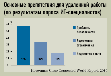 Мотивы вполне понятны — сотрудники хотят работать там, где это удобно. А вот компании далеко не всегда к этому готовы. По данным исследования, проведенного по заказу Cisco аналитическим агентством InsightExpress, в России доступом к корпоративной информации в любое время и в любом месте располагают лишь 17% респондентов — это почти вдвое меньше среднего мирового индекса, равного 31%. Главной проблемой, мешающей удаленной работе, опрошенные россияне назвали нехватку средств на приобретение соответствующей техники.