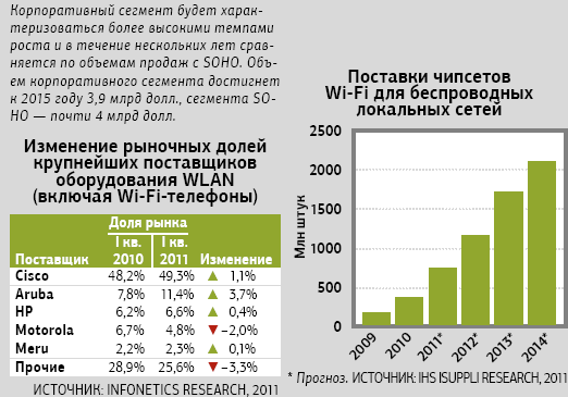 По прогнозам Dell'Oro Group, объем глобального рынка беспроводных локальных сетей в 2015 году превысит 8 млрд долл., что почти в полтора раза больше показателей 2010 года. Рост данного сегмента рынка, как отмечают зарубежные аналитики, стимулируется значительным увеличением числа пользовательских устройств с поддержкой Wi-Fi, а также продвижением более совершенной технологии 802.11n. Этот вывод подтверждается и российскими экспертами.