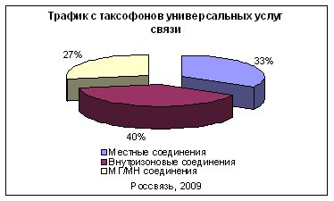 По данным Россвязи, в 2008 году объем оказанных универсальных услуг связи с использованием таксофонов составил в России более 6 млн мин., что почти в 2,5 раза больше, чем в 2007 году. Анализ структуры использования услуг показывает, что большую часть трафика (40%) составляют внутризоновые телефонные соединения. На местные телефонные звонки приходится 33% трафика, а на междугородние и международные вызовы - 27%.