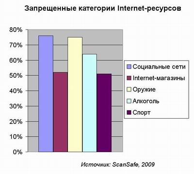 Как показало исследование, проведенное компанией ScanSafe, в первую очередь это касается социальных сетей. За последние полгода число компаний, относящих такие ресурсы к нежелательным, увеличилось на 20%. Таким образом, в 76% организаций посещение социальных сетей в рабочее время не просто не одобряется руководством, но и пресекается на технологическом уровне. Другими распространенными объектами блокировки являются Internet-магазины, сайты, посвященные оружию и алкоголю, а также спортивные информационные ресурсы. Разумеется, в данном «хит-параде» представлены только вполне добропорядочные категории Web-сайтов, признанные мешающими рабочему процессу. Подразумевается, что порнографические ресурсы, равно как и ресурсы, связанные с незаконной деятельностью, традиционно блокируются практически во всех компаниях. Однако в последнее время руководители стали обращать повышенное внимание на эффективность сотрудников. С учетом непростой экономической ситуации от персонала требуют более напряженной работы, кстати, иногда за меньшее вознаграждение. Посещение сотрудниками развлекательных ресурсов явно идет вразрез с попытками оптимизации рабочих процессов.