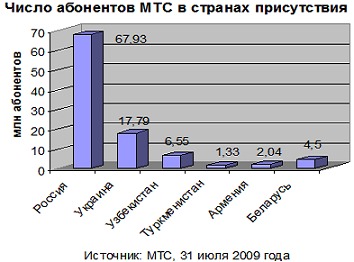 ОАО «Мобильные ТелеСистемы» сообщает, что консолидированное число абонентов компании по состоянию на 31 июля 2009 года составило 95,65 млн пользователей. В июле абонентская база МТС увеличилась на 0,62 млн клиентов, из которых на долю России пришлось 510 тыс. подключений. Всего же в России у МТС - 67,93 млн абонентов. В Украине компания обслуживает 17,79 млн пользователей, в Узбекистане - 6,55 млн, в Туркменистане - 1,33 млн, в Армении - 2,04 млн. Неконсолидированное дочернее предприятие МТС в Республике Беларусь, СООО «Мобильные ТелеСистемы», в котором МТС принадлежит 49% акций обслуживает еще 4,5 млн абонентов. Таким образом общее число пользователей сети МТС превышает 100,14 млн.