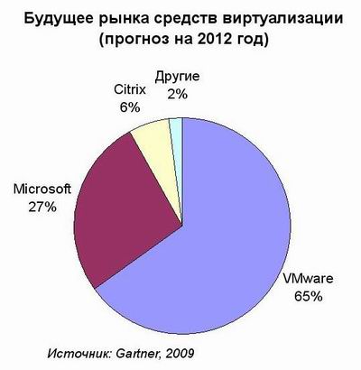 Насколько быстро происходит внедрение серверной виртуализации? В течение последних четырех лет виртуализация применялась лишь в рамках ЦОД очень крупных компаний, где была действительно оправдана, позволяя экономить. При этом 89% рынка контролировала VMware, не оставляя другим сколько-нибудь серьезных шансов. Однако сейчас растет интерес к виртуализации среди компаний SMB, и именно за счет этого сегмента будет наблюдаться лавинообразный рост рынка. В его рамках Microsoft, чьими главными конкурентными преимуществами являются цена и мощный бренд, способна отвоевать значительную долю рынка. Согласно прогнозам, к 2012 году рыночная доля VMware сократится до 65%, хотя число виртуальных машин, запущенных на этой платформе, и вырастет в 10 раз.