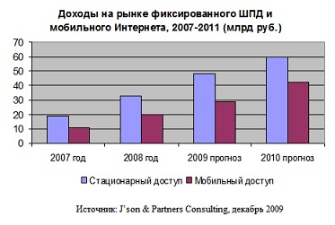 По данным J'son & Partners Consulting, к концу первой половины 2009 года 23,6% всех российских домохозяйств (12,4 млн) имели проводной широкополосный доступ в Интернет (рост рынка по отношению к аналогичному периоду 2008 года составил 111%). Основная часть (60%) домашних подключений зарегистрирована за пределами двух столиц и их областей. В 2008 году средний счет домашних пользователей за услуги ШПД составил 320 руб. в месяц, а в первом полугодии 2009 года - 300 руб. Дальнейшее снижение тарифов региональными провайдерами приведет к постепенному падению ARPU в этом сегменте (на 3-7% в год) до 250 руб. к 2013 году. Рынок мобильного Интернет-доступа на базе 3G и GPRS/EDGE составил в 2008 году 20,4 млрд руб. По итогам 2009 года J'son & Partners Consulting прогнозирует его рост на 43,6% до 29,3 млрд руб. При этом темпы роста доходов в сегменте фиксированного проводного ШПД в домашнем сегменте будут немного ниже. По оценкам аналитиков, они вырастут до 47,5 млрд руб. - на 42% по сравнению с показателем 2008 года.