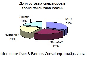 J'son & Partners Consulting выпустила информационный бюллетень о состоянии рынка сотовой связи в России. По данным аналитиков, в ноябре 2009 года количество зарегистрированных в России SIM-карт выросло до 205,5 млн. Уровень проникновения в целом по стране составил 144,7%, а в Московской лицензионной зоне – 185,6%. Совокупный прирост абонентской базы российских операторов за ноябрь 2009 года составил 0,45 млн или 0,22%. Вместе с тем, в ноябре 2009 года ежемесячный прирост снизился на 80,4% по сравнению с ноябрем 2008 года (на 1,85 млн). По количеству абонентов лидирует МТС с долей рынка в 33%, у «Билайна» - 25% рынка, у «МегаФона» - 24%, еще 18% абонентов обслуживают другие операторы сотовой связи.