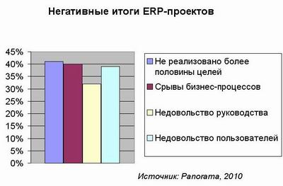 Отдельно исследование коснулось негативных результатов ERP-проектов, про которые обычно предпочитают молчать вендоры. Наиболее общими из них являются несоответствие созданного решения своим задачам (зачастую остаются нереализованными более половины целей проекта), срывы бизнес-процессов во время запуска системы в эксплуатацию и неудовлетворенные пользователи.