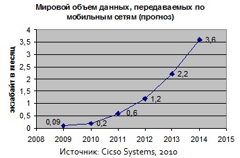 Cisco объявила результаты исследования «Индекс развития визуальных сетевых технологий и глобальный прогноз по мобильным данным за период с 2009 по 2014 год». В документе отмечается, что к 2014 году мировой объем данных, передаваемых по мобильным сетям, вырастет до 3,6 экзабайт в месяц и превысит годовой уровень в 40 экзабайт. Иными словами, за указанный период объем такого трафика увеличится в 39 раз, а среднегодовые темпы его роста составят 108%. Столь стремительный рост объема данных, передаваемых по мобильным сетям, связан с двумя глобальными тенденциями - распространением устройств с функциями мобильной связи и увеличением популярности мобильного видеоконтента. К 2014 году в мире будут работать более 5 млрд персональных устройств, подключенных к мобильным сетям, и миллиарды узлов связи «машина-машина». При этом 66% всего мобильного трафика к 2014 году будет генерировать мобильное видео, объем которого в период с 2009 по 2014 год вырастет в 66 раз.