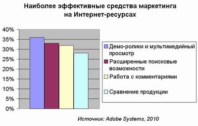 В 2010 году компании, осуществляющие инвестиции в мультимедийную интерактивную рекламу и социальные сети, получают наилучшие результаты с точки зрения увеличения объемов продаж и повышения степени удовлетворенности своих клиентов. Исследование, проведенное Adobe Systems, было направлено на выявление технологий, рассматриваемых бизнесом как наиболее эффективные для привлечения заказчиков через Web-сайты. Мобильные решения и системы кастомизации по-прежнему остаются наименее популярными направлениями – менее 10% респондентов осуществляют внедрение подобных решений в своих Интернет-ресурсах. Однако, ожидается, что в следующем году ситуация изменится. Компании хотят, чтобы их поняли и услышали в Интернете – именно по этой причине 75% опрошенных отметило, что на ближайший год планирует внедрение инноваций, направленных на привлечение внимания пользователей. В целом, в число наиболее эффективных инструментов входят ознакомительные ролики, дающие представление о продукте, и решения для мультимедийного просмотра, позволяющие рассмотреть продукт с разных сторон. Другими востребованными функциями являются расширенные поисковые возможности, работа с пользовательскими комментариями и сравнение продукции.