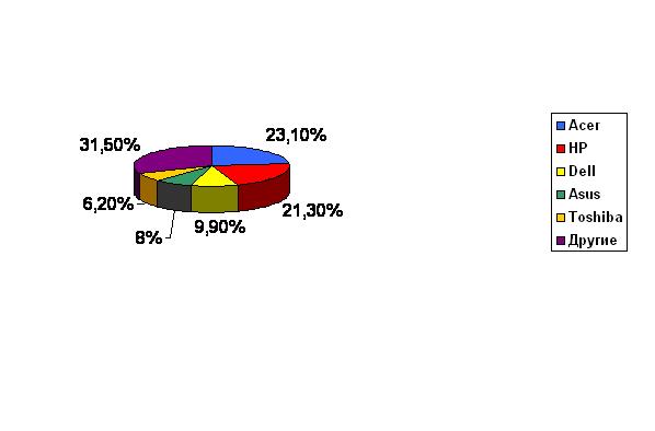 На первое место среди вендоров вышла компания Acer, рост отгрузок ПК которой по итогам четвертого квартала составил 33,9%, что соответствует рыночной доле в 23,1%. Второе место занимает HP с рыночной долей 21,3% (снижение на 7,5%). Далее следуют Dell (9,9%) и Asus (8%). Замыкает пятерку лидеров Toshiba с долей рынка 6,2%. Также серьезный рост продаж показали некоторые компании с меньшими рыночными долями - Apple, Samsung, Lenovo и Sony.