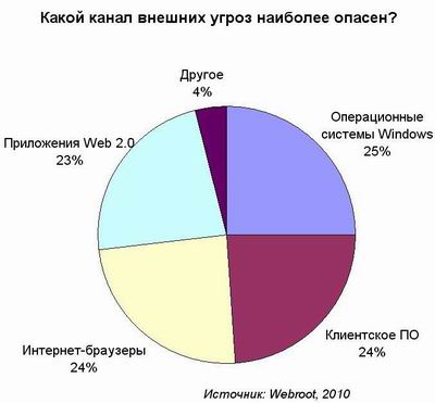 Как полагают ИТ-менеджеры компаний SMB, опрошенные экспертами Webroot, нежелательные программы, имеющие источником Web 2.0, существенно осложняют их работу. При этом подавляющее большинство воспринимает Web-угрозы гораздо более серьезно, чем атаки, проводимые по каналу электронной почты. Любопытно, что 25% опрошенных наиболее благодатным плацдармом для хакерских вторжений считает операционные системы семейства Windows. Чуть меньшее количество видит в качестве основного канала угроз клиентское ПО, уязвимости браузеров и приложения Web 2.0.