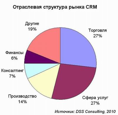 В 2009 году число внедрений систем класса CRM сократилось на 20%, как подсчитали в DSS Consulting. Таким образом, несмотря на заявления со стороны аналитиков о важности в кризисных условиях технологий, ориентированных на поддержку отношений с клиентами, снижение спроса на CRM-системы все же произошло. Однако картина не является однородной: общее число завершенных проектов увеличилось для 10 наименований CRM-систем из 21 постоянно и активно внедряющихся на рынке. В 2009 году основными заказчиками являлись компании с численностью персонала менее 100 сотрудников – доля таких компаний составила 78%, еще 17% - это компании с численностью сотрудников от 100 до 500. В основном CRM-системы внедряют небольшие компании, что в целом соответствует отраслевой структуре спроса: торговые и сервисные компании являются главной движущей силой рынка. По отраслевой принадлежности проектов лидируют именно сферы торговли и услуг (по 27% доли рынка внедрений), далее следуют производственные предприятия (14%). Меньшее, но, тем не менее, значимое число проектов аккумулировали консалтинговые компании и финансовый сектор.