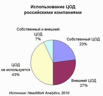 По данным HeadWork Analytics, лишь 27% российских компаний прибегает к услугам внешних ЦОД. При этом 23% использует услуги только внутренних ЦОД, а 43% просто «не доросли» до использования ЦОД, ограничиваясь серверной комнатой. Наиболее продвинутыми с этой точки зрения можно назвать оставшиеся 7% компаний: они ищут баланс между использованием внутренних и внешних услуг.