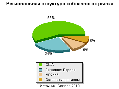 Мировой рынок облачных вычислений в 2010 году достигнет 68,3 млрд долл. Таким образом, по оценкам Gartner, его рост составит 17%. Как подчеркивают аналитики, в ближайшее время эта индустрия будет весьма активно развиваться, и к 2014 году приблизится к отметке 150 млрд долл. В настоящее время львиную долю пользователей облачных услуг обеспечивают страны Северной Америки и Западной Европы. Несмотря на ожидаемый рост популярности «облаков» в развивающихся регионах, в ближайшие пять лет ситуация кардинально не изменится. Например, доля США в общем объеме облачных сервисов в 2010 году составит 58%, а к 2014 снизится до 50%. Для сравнения, Западная Европа займет около 24% рынка, а на долю Японии придется 10%.