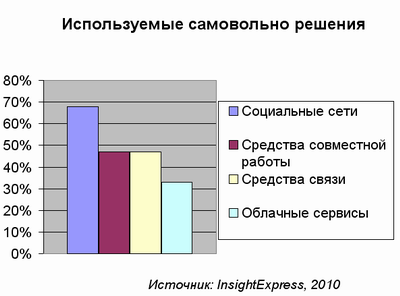 Сотрудники компаний постоянно нарушают корпоративные политики, используя на рабочих местах несанкционированные устройства и приложения. Как показало исследование, проведенное InsightExpress, в большинстве случаев нарушения заключаются именно в самовольной установке пользовательских приложений. Чаще всего речь идет об использовании социальных сетей, средств совместной работы, систем связи (например, Skype), а также облачных сервисов. Кроме того, в 41% компаний отмечают, что сотрудники пользуются несанкционированными устройствами, а более трети опрошенных заявило, что использование неразрешенных устройств в их организациях уже приводило к утечкам информации или ее утере. При этом 71% опрошенных ИТ-менеджеров признает, что строгие правила информационной безопасности негативно влияют на прием и удержание на работе сотрудников, особенно молодежи в возрасте до 30 лет. Возможно, именно из-за этого большинство специалистов заявило о готовности поддержать использование персональных устройств на рабочем месте, а 7% уже занимаются этой проблемой.