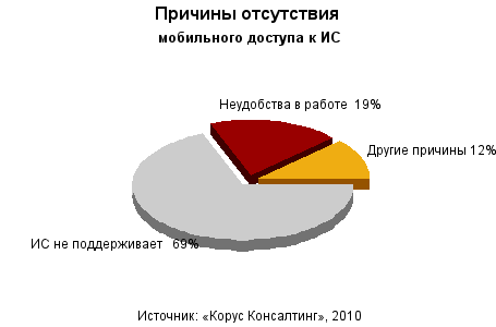 В 15% случаев системой с мобильного устройства пользоваться можно, но неудобно. Доступ к корпоративным информационным системам с помощью мобильных устройств зачастую рассматривается как резервный вариант, с неудобством которого приходится мириться. 20% называют в качестве причины отсутствие необходимости в масштабах компании: большинству сотрудников до сих пор проще позвонить, чем полагаться на связь через Интернет.