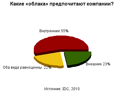 Концепция «внутренних» облаков выглядит для большинства компаний гораздо привлекательнее публичных. В ходе опроса, проведенного IDC, лишь 23% ИТ-менеджеров заявили о своем предпочтении публичным облакам, а 22% отметили, что привлекательность облачных сервисов примерно одинакова – независимо от истоков происхождения таких услуг. Многие компании, считающие возможным применение в своей деятельности облачных вычислений, планируют использовать именно комбинацию внешних и внутренних услуг, в зависимости от вида сервиса. Например, 75% желало бы организовать на платформе внутренних облаков средства совместной работы, и лишь 53% - корпоративную почту. Тем не менее, склонность компаний к внутренним сервисам пока не вызывает сомнений. Несмотря на это, в IDC ожидают взрывного роста рынка публичных облачных услуг. В 2009 году он составлял 19 млрд. долл., а к 2014 должен увеличиться почти втрое, достигнув 55 млрд. долл.