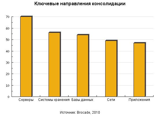 Три из четырех европейских компаний в течение ближайшего года планируют консолидацию своей ИТ-инфраструктуры. Причинами инвестиций в эту область является повышение производительности сети, упрощение управления и, в конечном счете, увеличение эффективности бизнеса. Результаты исследования, проведенного Brocade, показали, что 76% предприятий рассматривают консолидацию ИТ в числе трех самых приоритетных вопросов на ближайший год. При этом консолидация опережает по значимости такие направления, как виртуализация и информационная безопасность. Говоря об основных направлениях консолидации, 70% называют существующие серверы, 56% – системы хранения, а 54% – базы данных.