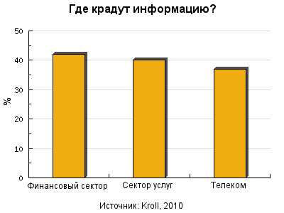 В 2010 году кража информации стала самой популярной формой мошенничества, обогнав прежнего лидера – кражу материальных активов. По данным компании Kroll, 27% компаний заявляют о том, что столкнулись с фактами кражи информации в течение последнего года. Согласно данным прошлогоднего исследования, ранее от этого вида преступлений страдали всего 18% опрошенных организаций. Наиболее пострадавшими от кражи электронных данных являются представители финансового сектора, отрасли профессиональных услуг и компаний, занимающихся телекоммуникациями и медиабизнесом. Самой проблемной страной был назван Китай, на втором месте Колумбия, а замыкает тройку стран Бразилия. Несмотря на растущие риски, количество компаний, планирующих в будущем году повысить расходы на информационную безопасность, сократилось. В 2010 году об этом заявили 48% опрошенных, тогда как в исследовании прошлого года их доля составляла 51%.